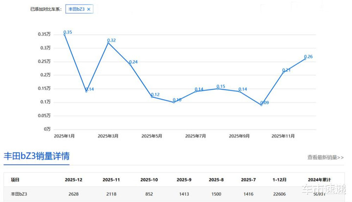 根据汽车行业公开的单车型销量显示,在过去的2025年,一汽丰田bZ3全年累计销量只有22606台,其中,12月销量2628台。与2024年50931台的全年总销量相比,丰田bZ3出现了明显的大幅度销量下滑,可以说是同比销量“拦腰斩”了。